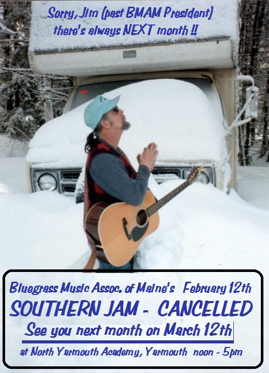 ATTENTION: CANCELLATION – BMAM SOUTHERN JAM scheduled for February 12th at the North Yarmouth Academy Music Room in Yarmouth, Maine