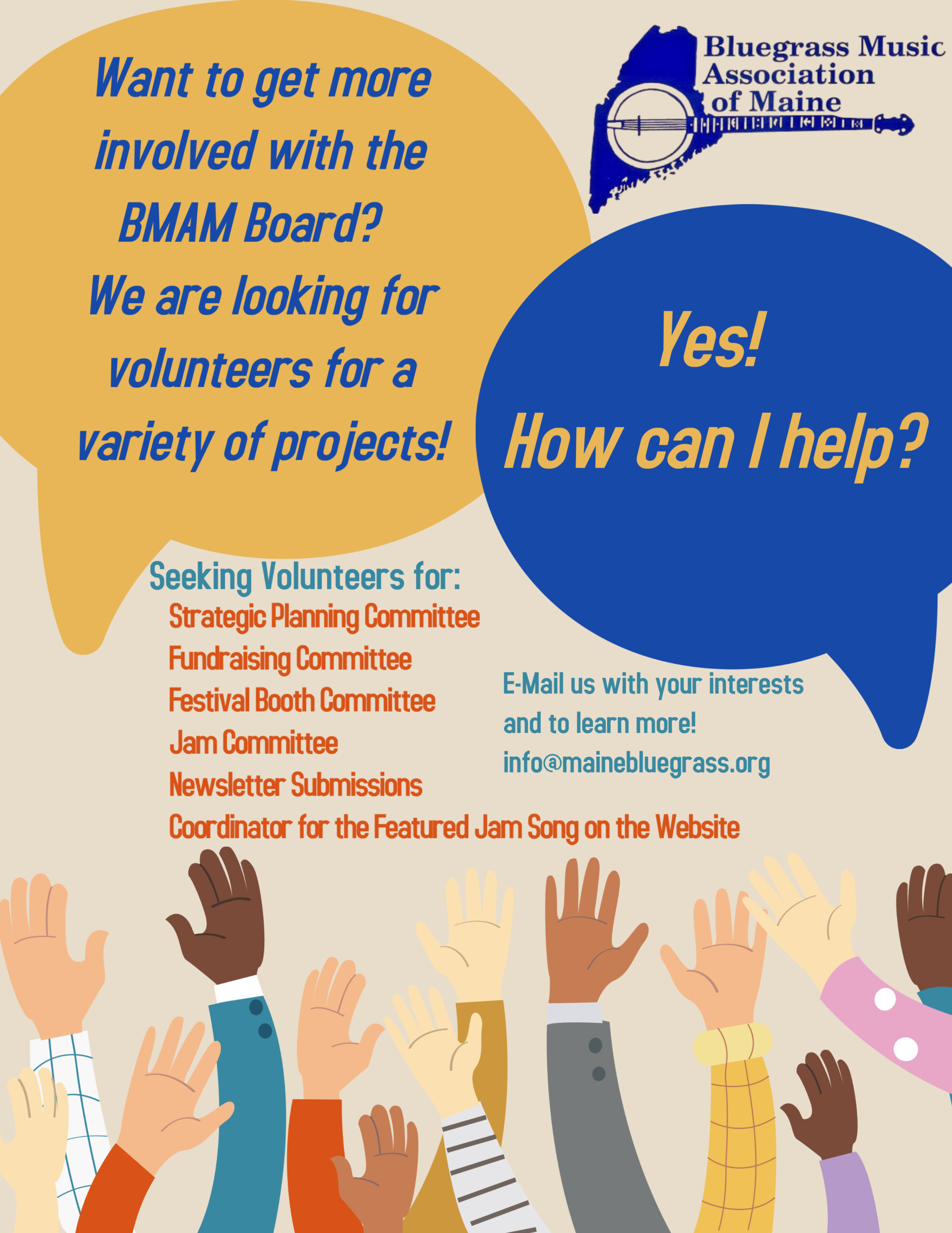 We have many opportunities for members to be more involved within the Bluegrass Music Association of Maine!