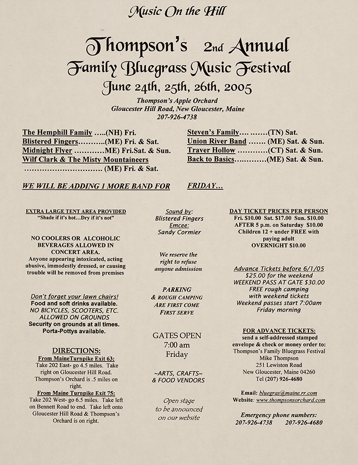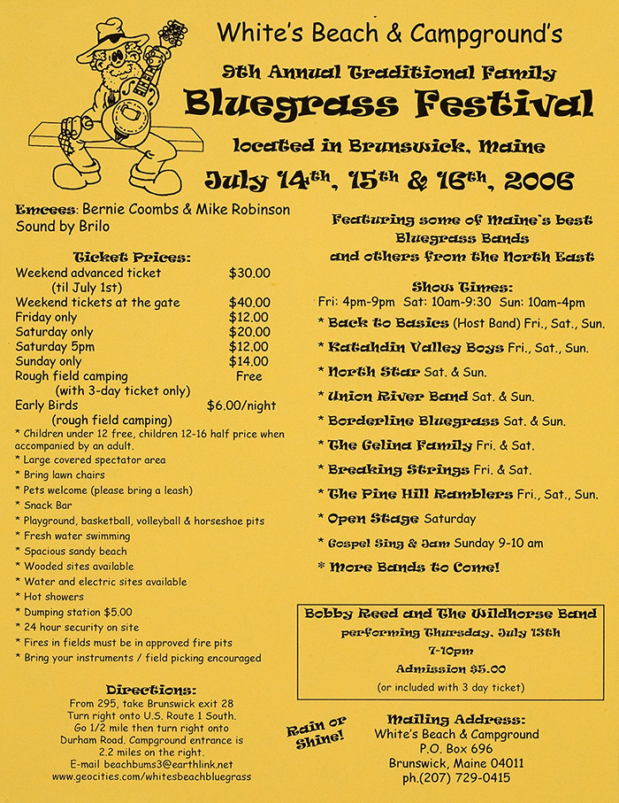 BMAM Archives Project » BMAM ARCHIVES - Posters White's Beach & Campground's 9th Annual Traditional Family Bluegrass Festival, 2006 ◄ 1 ... 4 5 6 ... 15 ►